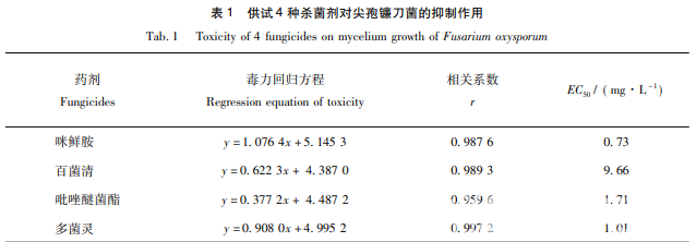 使用 EXCEL2016,DPS7. 05 數據處理軟件對所得的數據進行統計分析,得出各藥劑的 毒力回歸方程、EC50和相關系數。