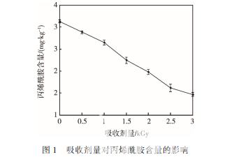 輻照消解油炸土豆片中丙烯酰胺是利用 60Co 衰 變產生的 γ 射線處理淀粉類熱加工食品,通過輻照過 程中基質水分產生的自由基誘導丙烯酰胺發生聚合 反應生成無毒的聚合物,從而達到消除基質中已生成 丙烯酰胺的目的。吸收劑量和基質含水量對丙烯酰胺 的輻照消解效應影響較為顯著,Na2CO3、異抗壞血酸 鈉、芝麻酚可促進丙烯酰胺的輻照消解,添加芝麻酚 后丙烯酰胺的消解率最高為 60.49%。此研究從增加 丙烯酰胺分子量的角度考慮,使用較為成熟的輻照技 術聚合消除已生成的丙烯酰胺,不僅對食品風味無影 響且成本較低,是對淀粉類熱加工食品中丙烯酰胺控 制方法體系的補充,可為淀粉類農產品熱加工后控制 丙烯酰胺的含量提供理論基礎。