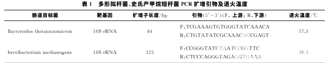 將多形擬桿菌、史氏 產甲烷 短 桿 菌 的 PCR 產 物 經 切 膠、回 收 后 作 為 DNA 標準品,將 標 準 品 稀 釋 為 濃 度 梯 度 為 101 ~ 108 copies/μL的 DNA 樣本作為陽性模板,同 時 以 Nuclease-Free-water為陰性 對 照,每 個 樣 平 行 重 復 3次,反應體系(20μL):上、下游引物各0.5μL,熒 光染料(SYBRGreenI)10μL,DNA 模板2μL,Nu- clease-Free-water7μL,反 應 程 序:預 變 性 95℃、 2min,變性95℃、5s,退火(表1)、30s,35個循環(huán)。 由實時熒光定量 PCR儀自動繪制擴增曲線、熔鏈曲 線,產 物 通 過 熔 鏈 曲 線 證 實。反 應 結 束 后 用 PCR 儀附帶軟件分析,自動生成標準曲線。